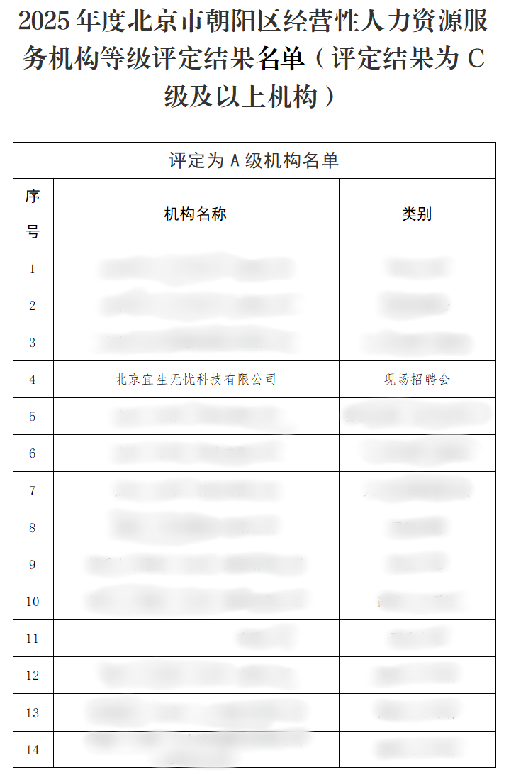 近日,在2025年度北京市朝阳区经营性人力资源服务机构等级评定中,北京宜生无忧科技有限公司凭借卓越的综合实力、创新的服务模式以及突出的区域贡献,成功获得A级认证。